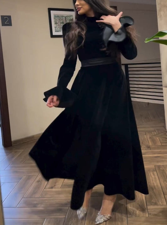 Plain Elegant Stand Collar Long sleeve Midi Party Dress